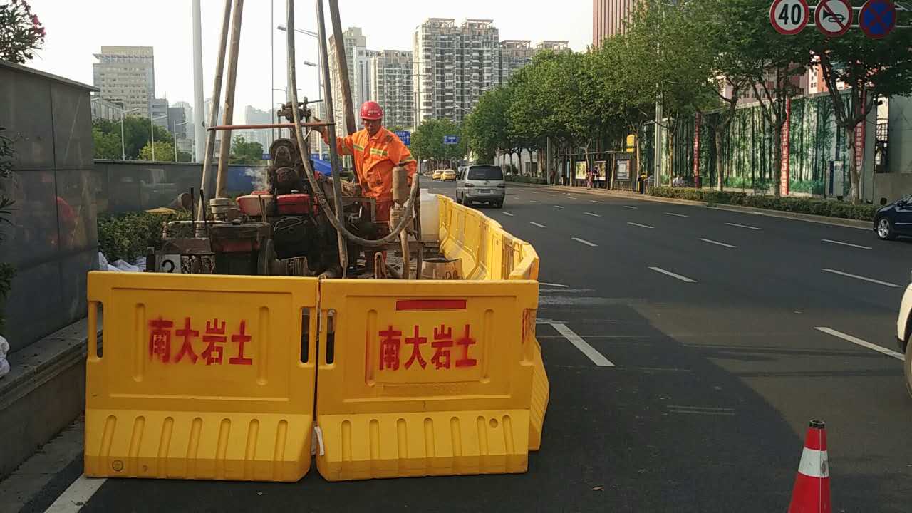 2017年5月中旬,隨著身著南大巖土字樣工作服的技術及施工人員在漢中門大街與江東路交叉口進行施工圍擋,標志著南京地鐵九號線D9-XK02標地質勘察初勘施工正式啟動。本標段南起漢中門大街,沿江東路向北至定淮門大街止,分為三站三區間,全長約2.8km,初勘計劃工期2個月。