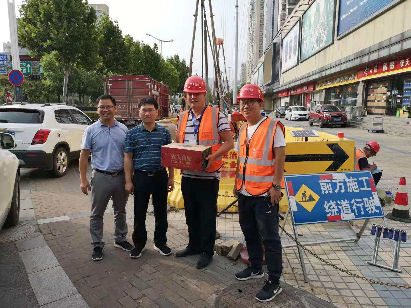葉繼權、劉松一行對南京首建中心監測項目、馬群綜合換乘中心公交停保場監測項目、南部新城管廊監測項目上的工作人員送上了防暑降溫用品、礦泉水等慰問品,關切地詢問了一線作業人員的生產生活情況(見照片5~7)。
